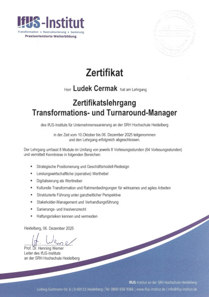 Anschließend habe ich die Atmosphäre in der bestehenden tschechischen Niederlassung verändert. Aufbau und Stabilisierung des neuen Teams. Sicherstellung der Vertretbarkeit und Aufbau einer neuen Kommunikation mit der Zentrale. Innerhalb eines Jahres reduzierte ich den Rückstand von 1,6 Mio. EUR auf 0,06 Mio. EUR und übergab das stabilisierte Unternehmen an einen neuen Prokuristen, der praktisch keinen Rückstand hatte.