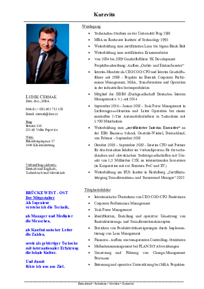 Als Ingenieur verstehe ich die Technik, als Manager und Mediator die Menschen, als Kaufmännischer Leiter die Zahlen, sowie als geb. Tscheche mit int. Erfahrung die lokale Kultur. Und damit führe ich uns ans Ziel.