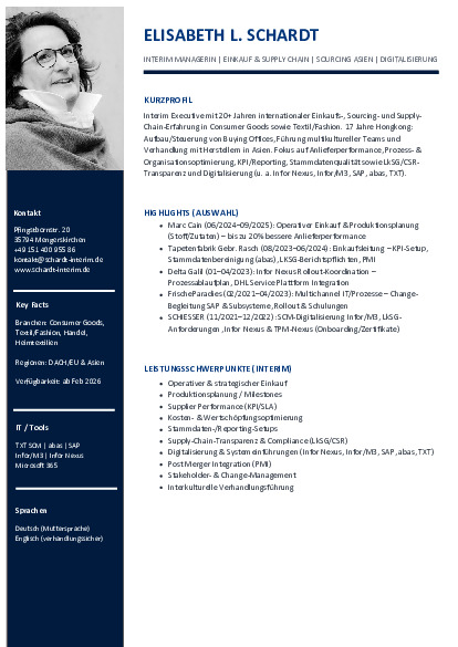 Schwerpunkte: Interim-Einkaufsleitung, Produktionsplanung, Post-Merger-Integration, KPI- und Prozessoptimierung, Digitalisierung (SAP, Infor Nexus, abas), Lieferantenmanagement und LKSG.