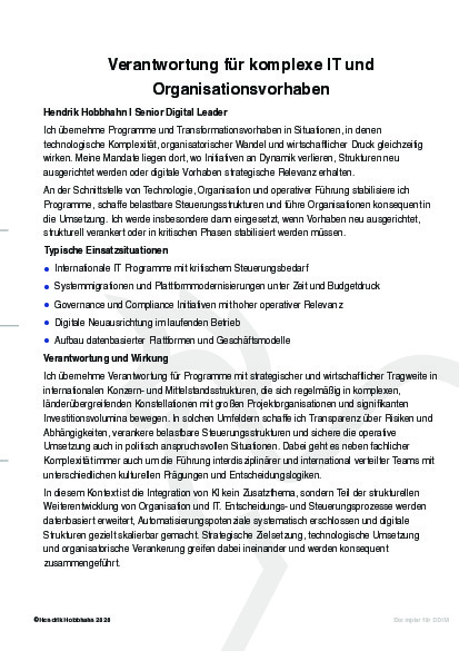 Ziel meiner Mandate ist es, Transparenz in komplexen Programmen herzustellen, Entscheidungswege zu verkürzen und geschäftskritische Vorhaben zuverlässig in die Umsetzung zu führen.
