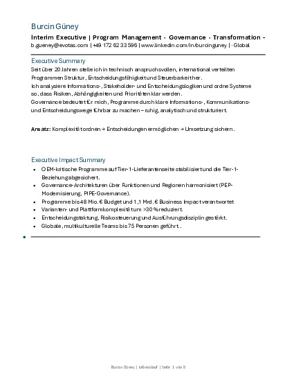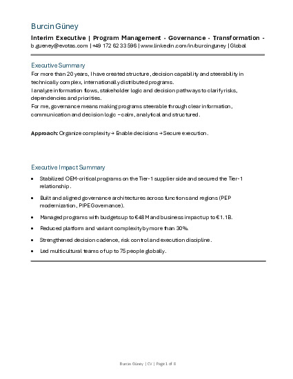 Genau an dieser Stelle unterstütze ich Unternehmen als Interim Executive in Transformation, Program Management, PMO und Governance. Seit über 20 Jahren verbinde ich strategische Zielbilder mit operativer Umsetzung, ordne Komplexität, stelle Alignment her und baue Entscheidungslogiken auf, die Programme stabilisieren, Transformation handlungsfähig machen und Organisationen wieder in die Umsetzung bringen.